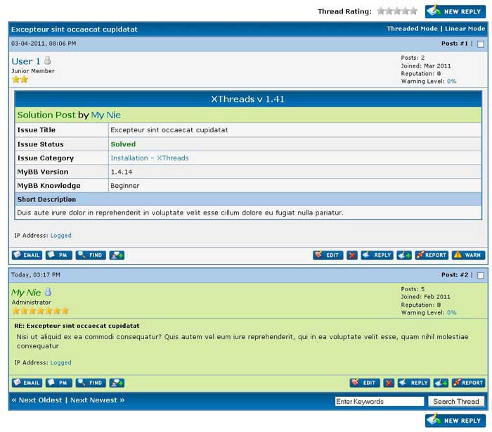 Code:<setvar xtsviewable>($mybb->user['uid'] == $thread['uid'] || is_moderator($fid, '', $mybb->user['uid'])) && THIS_SCRIPT == 'showthread.php'</setvar> <setvar firstpost>$tplvars['xtsviewable'] ? get_post($thread['firstpost']) : ''</setvar> <setvar solvebutton1>$tplvars['xtsviewable'] ? ' --><form action="editpost.php" method="post"><input type="hidden" name="my_post_key" value="'.$mybb->post_code.'" /><input type="hidden" name="action" value="do_editpost" /><input type="hidden" name="pid" value="'.$thread['firstpost'].'" /><input type="hidden" name="xthreads_sis" value="Solved" /><input type="hidden" name="xthreads_xtspt_solvepost" value="' : ''</setvar> <setvar solvebutton2>$tplvars['xtsviewable'] ? '" /><input type="submit" value="Mark this post as solution" /></form><!-- ' : ''</setvar> - Display Format: