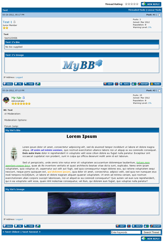 • MyBB parser (for textbox and textarea): HTML, MyCode, img code, video code, smilies, badwords.