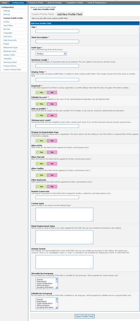 With this plugin, we'll have (hopefully) some additional settings like XThreads for our Custom Profile Fields: