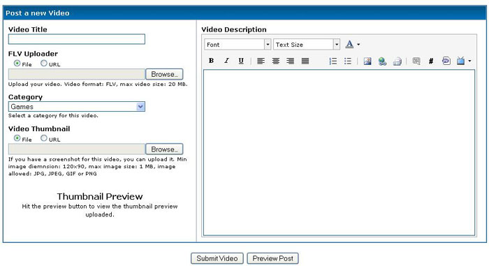 • Description: Upload your video. Video format: FLV or MP4 max video size: 20 MB.