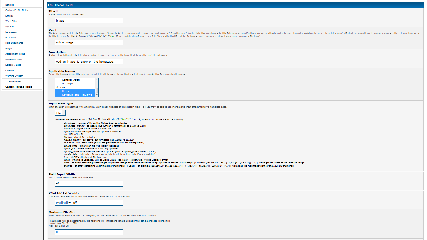 XThreads is one of my larger plugins which I have been working on for a while. Originally planned to release it inline with MyBB 1.6 What does it do? Take a look at RateU's forum for some nice ideas of what it can do. I also have some more basic examples here of what can be done with XThreads. I'm pretty sure there are many other applications of this plugin, but those examples just give you some simple ideas. The basic idea is giving you the ability to define custom fields for your threads, and providing methods to give you a lot of flexibility with customising forums. Warning: I'm not going to bother with "beta" labels and so on. I've done some testing on this myself, but it's by no means extensive. Use this at your own risk. Installation Instructions: standard installation procedures apply - you can find them in the announcement here. You may need to CHMOD the uploads/xthreads_ul/ folder to 0777 after uploading the files (probably won't though). Upgrade Instructions: unless stated otherwise, the general procedure for upgrades is to simply upload the new files, then visit your AdminCP. In there, you'll be presented with a notice to run the upgrade - just follow what it says from there on. Usage Instructions: this is a complex plugin, and unfortunately, you're probably going to have to figure this out yourself, depending on what you want to achieve with this plugin. HTML and CSS knowledge is strongly recommended; you should also be familiar with MyBB's template system. Some demonstrations can be found here - hopefully these will give you a good idea of how things work. I suggest looking at the thread descriptions example, as this is fairly easy to understand (IMO). If you can understand how everything works, there, perhaps try out the gallery example. Known conflicting plugins - MyPlaza Turbo - If you are using MyPlaza Turbo, note that the author decided to use a particularly odd method to implement certain functionality, practically destroying compatibility with any plugin which hooks into the forum add/edit routines. I've included a patch to address this issue - you need to replace inc/myplaza/myplaza_admin_plugin.php with the following file (it's unlikely that this will be committed as the author has decided to discontinue development) myplaza_admin_plugin.php (Size: 56.27 KB / Downloads: 2722)- PL9 Forum Icons - Affects certain functionality. See here for a solution. - PHP in Templates, v1.4 or older - Similar to PL9 Forum Icons - solution is just to update to the latest version. - MyAdvertisements - (update: older versions only, later versions may not conflict) Affects some thread functionality, see here for a solution. - Group Post CSS - See here http://mybbhacks.zingaburga.com/showthre...http://mybbhacks.zingaburga.com/showthread.php?tid=378&pid=59 All bug reports, suggestions, criticisms are appreciated (though I may not always implement suggestions) so please feel free to post them. If you find this plugin useful, I would be grateful if you could give some token of appreciation for the work that has gone into this, and perhaps post some example usages you've come up with in the XThreads forum to help others get an idea of what can be achieve with this plugin (and for my own interest's sake ).Github: https://github.com/zingaburga/XThreads-MyBB-Plugin Note: do NOT use the Github version, unless you know what you're doing Changelogs: v1.10, v1.20, v1.21, v1.22, v1.23, v1.24, v1.25, v1.26, v1.27, v1.30, v1.31, v1.32, v1.337, v1.40, v1.41, v1.42, v1.43, v1.44, v1.45, v1.46, v1.47, v1.50, v1.51, v1.52, v1.53, v1.60, v1.61, v1.62, v1.63, v1.64, v1.65, v1.66, v1.67, v1.68